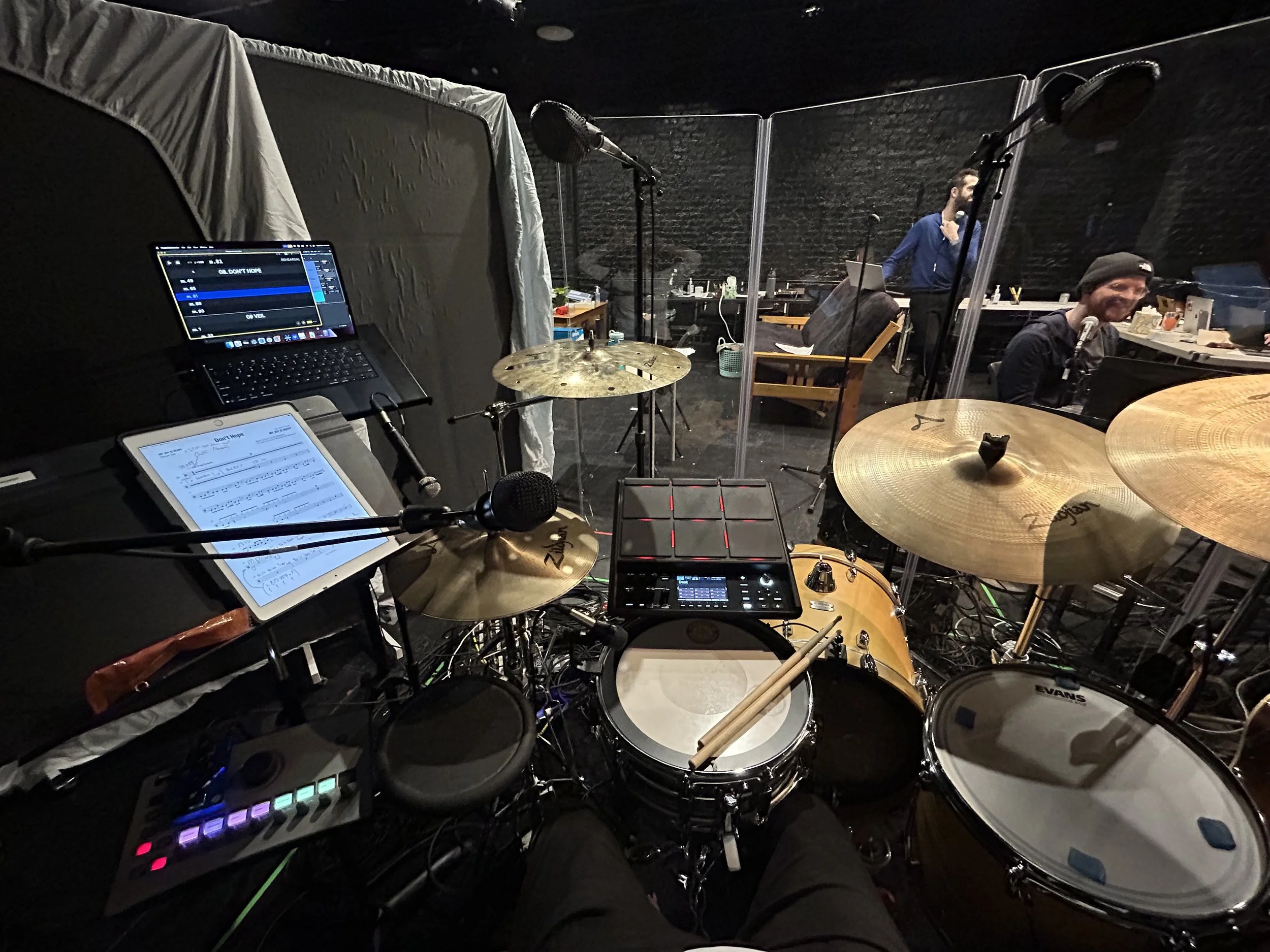 We had a one-week orchestration workshop in January followed by two weeks of rehearsals and a week of tech. It’s hard to believe our first preview is this Wednesday! For this show, I am playing acoustic drum set, SPD, singing, dancing, acting, and running Ableton! We are also the first theatre production in NYC to use KLANG Immersive In-Ear Mixing Processors, thanks to our absolutely brilliant sound designer, Nick Kourtides.